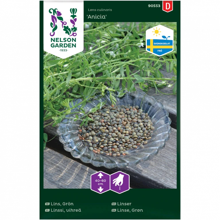 Velsmagende grøn linse. Planten giver masser af bælge med en til to linser i hver. Kan behøve plantestøtte. Lad linserne tørre på planten før høst. Skil linserne fra bælgen ved at lægge hele planten i en stofpose, ryst og rens derefter linserne frem. Bruges kogte i f.eks. salat og suppe. Trives i let og veldrænet jord. Holdes fugtig i begyndelsen af væksten, når planten har etableret sig, tåler den en vis tørke.