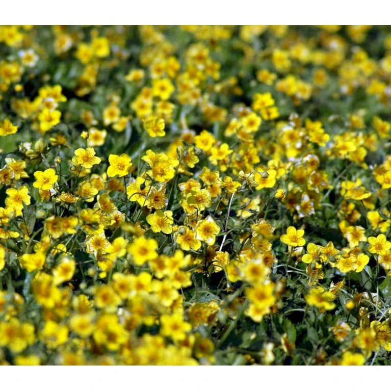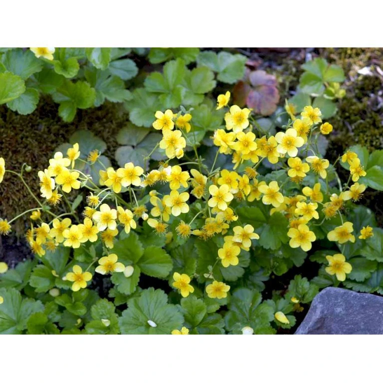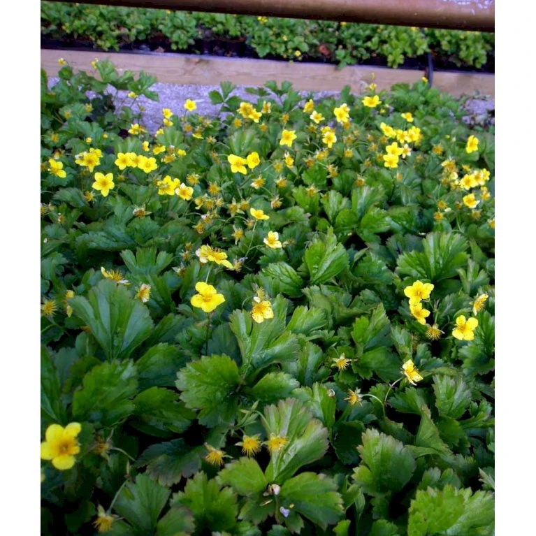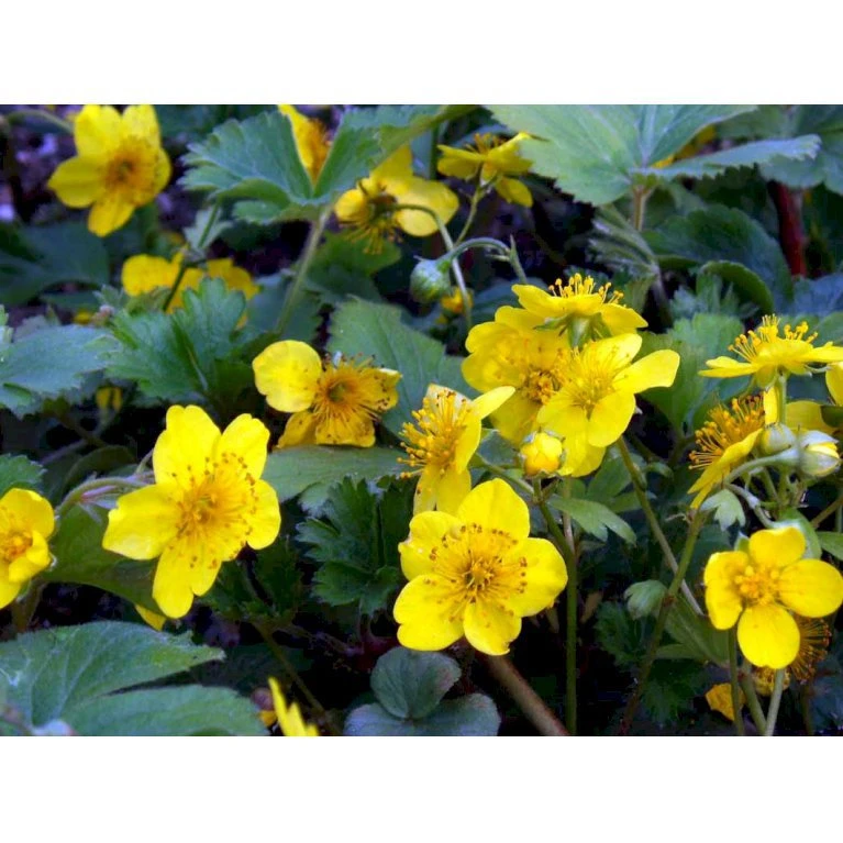 April – maj. Klart gule blomster, som ligner jordbærplantens blomster.