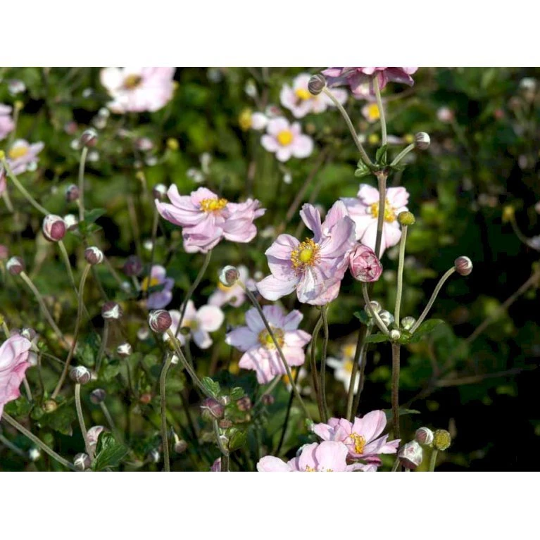 August- oktober. Meget store rent rosa anemoneblomster på lange tynde stilke over det fligede løv.